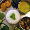 The meal includes rice, bottle gourd in gram lentil (chana dal mein lauki), dry potato with dill (aalu aur soa bhujiya), fenugreek pakoda (methi ka pakoda), spinach (palak ka saag), potato and fresh peas (aalu matar ki sabzi), coriander chutney (dhaniya ki chutney), fried bottle gourd in gram flour paste (lauki ka bachhka) and fried green chilly mixed with fresh lemon juice.