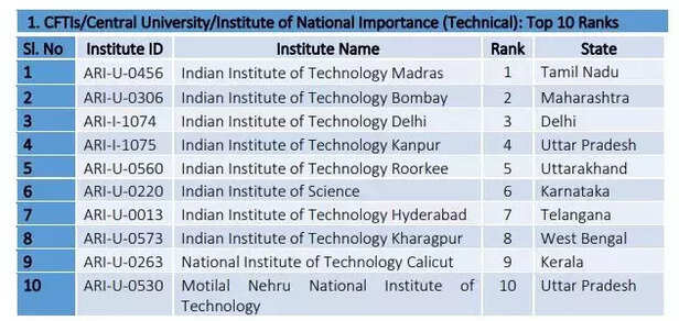 शिक्षा मंत्रालय ने देश के टॉप इंस्टीट्यूशन्स रैंकिंग यानी अटल रैंकिंग ऑफ इंस्टीट्यूशन्स ऑन इनोवेशन अचीवमेंट्स (एआरआईआईए), 2021 की जारी है। अटल रैंकिंग ऑफ इंस्टीट्यूट्स ऑफ इनोवेशन एचीवमेंट्स में एक बार फिर से आईआईटी मद्रास ने पहला पायदान पाया है।