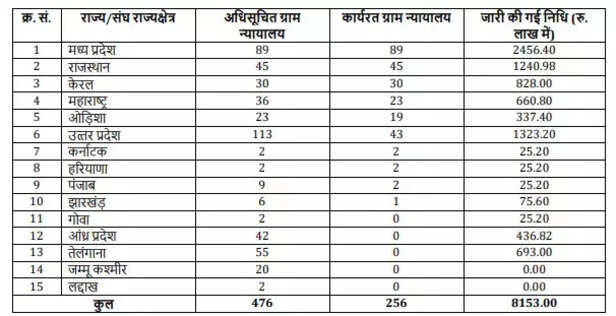 इसके जवाब में विधि एवं न्याय मंत्री ने कहा कि देश में 15 राज्यों में अब तक 476 ग्राम न्यायालय प्रस्तावित हैं, जिनमें से 10 राज्यों में 256 ग्राम न्यायालय कार्यरत हैं। सरकार ने गोवा, तेलंगाना, आंध्र प्रदेश, जम्मू-कश्मीर और लद्धाख में एक भी ग्राम न्यायालय अब तक संचालित नहीं हो पाया है।