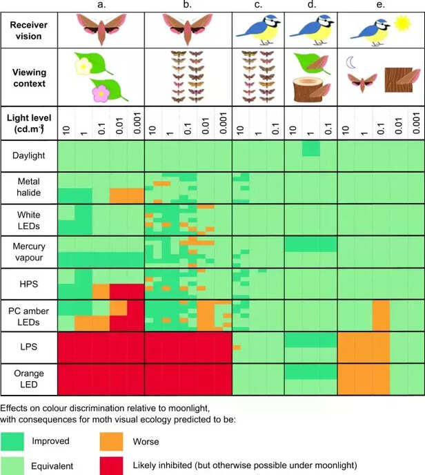 अध्ययन में पाया गया कि एलिफेन्ट हॉक मोथ नामक पतंगे की दृष्टि कुछ विशिष्ट प्रकार की रोशनी में बढ़ जाती है, जबकि प्रकाश के कुछ अन्य रूपों से इन पतंगों की दृष्टि बाधित होती है। वहीं, लगभग हर प्रकार की प्रकाश व्यवस्था में एलिफेन्ट हॉक मोथ का शिकार करने वाले पक्षियों की दृष्टि में सुधार देखा गया है।