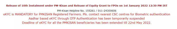 पीएम किसान पोर्टल (pmkisan.gov.in) पर एक संदेश प्रसारित हो रहा है, जिसमें कहा गया है कि PM KISAN के रजिस्टर्ड किसानों के लिए e-KYC अनिवार्य है। कृपया, आधार आधारित ओटीपी प्रमाणीकरण के लिए किसान कॉर्नर में ईकेवाईसी विकल्प पर क्लिक करें और बायोमेट्रिक प्रमाणीकरण के लिए निकटतम सीएससी केंद्रों से संपर्क करें।
