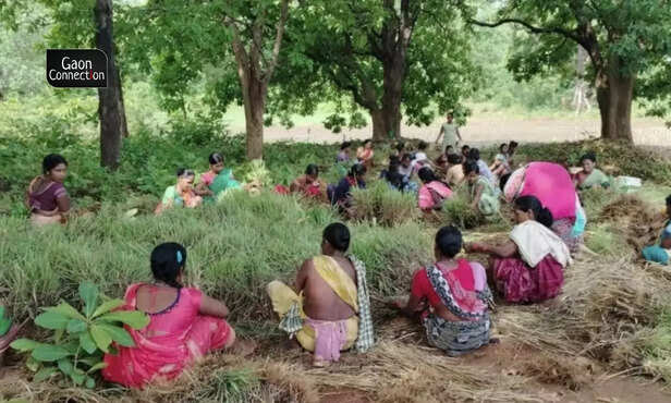 Agricultural labourers at Sahoo's field. Sadly, his enthusiasm was dampened when the land on which he was growing the lemongrass got waterlogged, as it was low lying.
