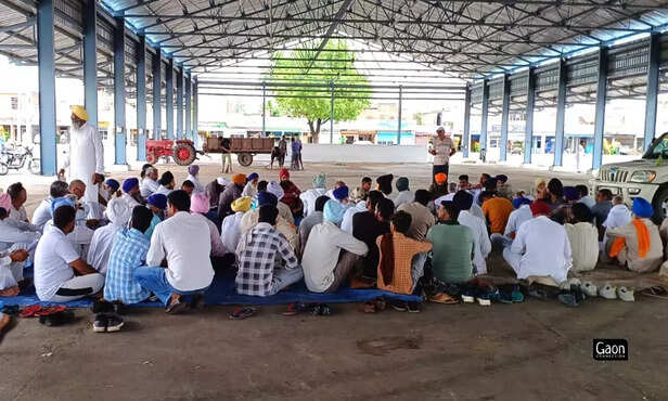 At the Nai Mandi in Ambala, more than a hundred farmers after their long march there from several villages in Haryana, sat in a tin shed on durries spread out on the floor, as their leaders addressed them. A police bus with about 15-20 policemen in it stood at a distance. A few policemen sat on cots placed outside.
