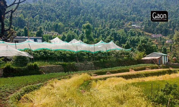 Anti-hail nets are used to protect kiwi fruit from getting damaged during hail storms which cost Rs 35-40 per square metre. Photo by Megha Prakash.