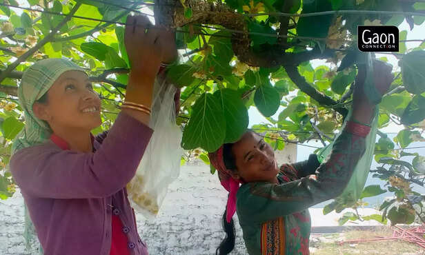 Kiwi farming is labour-intensive as labourers have to cross pollinate the plant manually by rubbing the male and female flowers together. Photo by Gaon Connection.