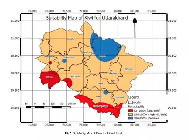Meanwhile, a 2018 study, Site suitability analysis for kiwi fruit plantation in Uttarakhand using GIS, has found kiwi fruit can be grown on the larger area of Uttarakhand state, most of the area of Uttarakhand state is highly suitable for growing the kiwi except District Udham singh nagar, Haridwar, and some part of Dehradun while district Chamoli, some part of Tehri Garhwal and some part of Nainital are suitable for growing Kiwi.