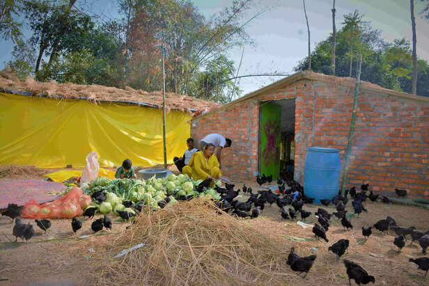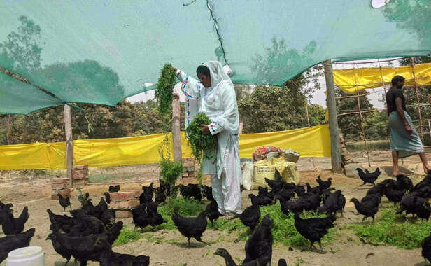 मुर्गियों को हरी घास देती हैं, जिससे लागत में कमी आए। फोटो: दिवेंद्र सिंह