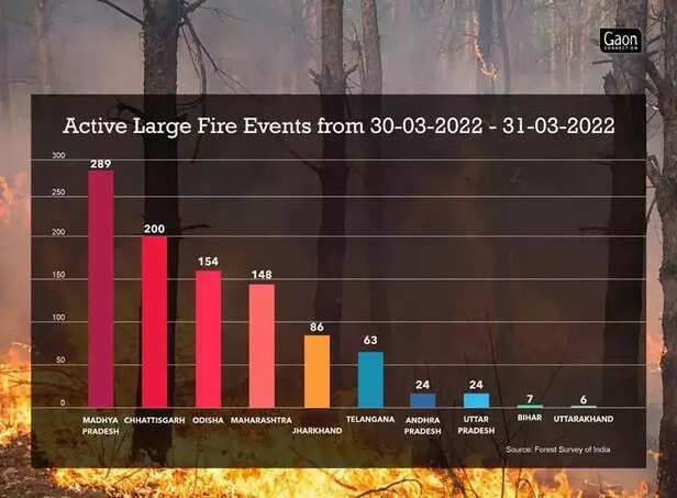 भारतीय वन सर्वेक्षण द्वारा उपलब्ध कराए गए आधिकारिक आंकड़ों के अनुसार, 30 मार्च और 31 मार्च को दो दिनों में 'बड़ी आग की घटनाओं' के कम से कम 1,026 मामले सामने आए। छत्तीसगढ़ और मध्य प्रदेश में आग की सबसे अधिक घटनाएं हुईं। क्रमशः 200 और 289 मामलों के साथ दी गई अवधि के बाद ओडिशा में 154 ऐसे मामले दर्ज किए गए। भारतीय वन सर्वेक्षण की रिपोर्ट 2021 ने रेखांकित किया कि भारत में वन क्षेत्र का 10.66 प्रतिशत क्षेत्र 'अत्यंत से बहुत अधिक' अग्नि प्रवण क्षेत्र की श्रेणी में आता है।