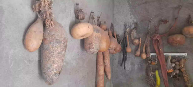 रामलोटन के घर की दीवार पर टंगी विभिन्न प्रकार की सूखी लौकी। फोटो- सचिन तुलसा त्रिपाठी हिमालय से ले आये ब्राम्ही