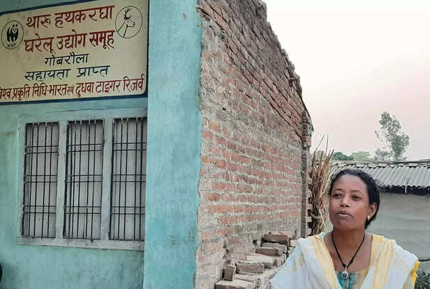 इनके घर के बाहर एक दीवार में बड़े अक्षरों में पेंट से लिखा है, 'थारू हथकरघा घरेलू उद्योग समूह' गोबरौला, सहयोग- विश्व प्रकृति निधि भारत (WWF) एवं टाईगर रिजर्व। आरती लिखे हुए शब्दों की तरफ इशारा करते हुए कहती हैं, "हमारे यहां पहले एक ही लूम (हैंडलूम) लगा था, हमारे पास ज्यादा पैसे नहीं थे। बाहर से जो भी घूमने आते और जिन्हें पता चलता कि मैं हैंडीक्राफ्ट बनाती हूं तो वो मेरे पास सामान खरीदने आते थे।"