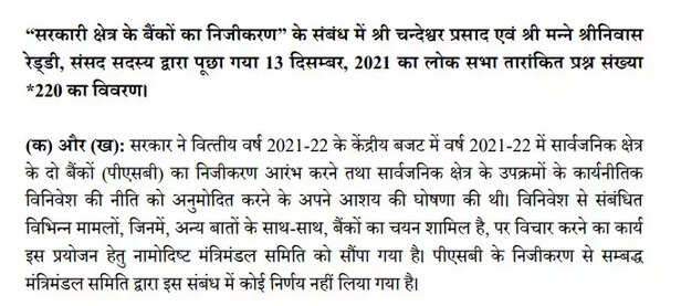 इन सवालों के जवाब में 13 दिसंबर को वित्त मंत्री निर्मला सीतारमण ने लोकसभा में दिए लिखित जवाब में कहा, "सरकार ने वित्तीय वर्ष 2021-22 के केंद्रीय बजट 2021-22 में सार्वजिनक क्षेत्र के दो बैंकों (पीएसबी) का निजीकरण आरंभ करने तथा सार्वजनिक क्षेत्र के उपक्रमों के कार्यनीतिक विनिवेश की नीति को अनुमोदित करने की घोषणा की थी, विनिवेश से संबंधित विभिन्न मामलों, जिसमें अन्य बातों के साथ-साथ बैंकों का चयन भी शामिल है पर विचार करने का कार्य इस प्रयोजन हेतु नामोदिष्ट मंत्रिमंडल समिति को सौपा गया है। पीएसबी के निजीकरण के संबंध में मंत्रिमंडल समिति द्वारा कोई निर्णय नहीं लिया गया है।"