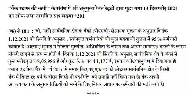 सरकार के संसद में दिए गए एक जवाब के मुताबिक देश 12 सार्वजनिक बैंकों में 41000 से ज्यादा पद खाली हैं। तेलंगाना राष्ट्र समिति की सांसद अनमुलुा रेवंत रेड्डी के सवाल के जवाब में सरकार ने सदन में बताया कि "1 दिसंबर 2021 के अनुसार देशभर 12 सार्वजनिक बैंकों में कुल स्वीकृत कर्मचारियों की संख्या में 95 फीसदी कर्मचारी कार्यरत हैं। आंकड़ों के अनुसार 12 सरकारी बैंकों में कुल 8,0,5986 पद हैं, जिसमें से 41777 पद रिक्त हैं। सरकार ने कहा कि रिक्तियां बैंक कर्मियों के सेवानिवृत्ति आदि से होती हैं, जिन्हें बैंक अपनी सतत प्रक्रिया के द्वारा भरते रहते हैं।"