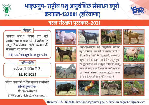 देसी नस्ल की गाय-भैंस, मुर्गी-बतख, भेड़-बकरी जैसे पशुओं के संरक्षण के लिए आईसीएआर- राष्ट्रीय पशु आनुवांशिक संस्थान ब्यूरो ने नस्ल संरक्षण पुरस्कार-2021 के लिए आवेदन मांगे हैं।
