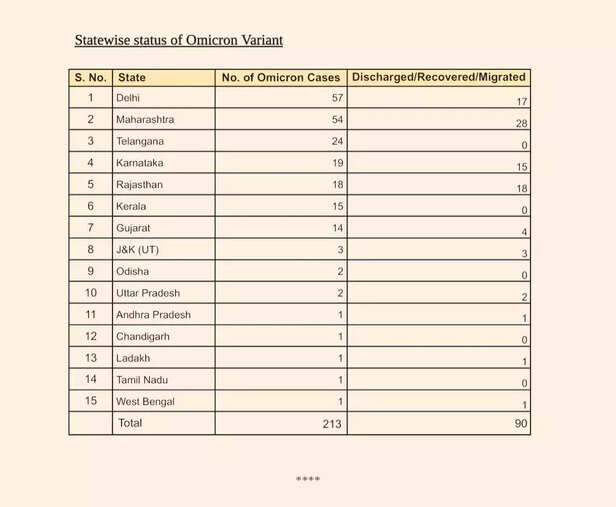पिछले कुछ दिनों में देश में ओमिक्रॉन संक्रमण के मामले तेजी से बढ़े हैं, अब तक 15 राज्यों में ओमिक्रॉन पहुंच चुका है। स्वास्थ्य एवं परिवार कल्याण मंत्रालय के अनुसार सबसे अधिक मामले दिल्ली में हैं, यहां पर 57 लोग इससे संक्रमित हो गए हैं, दूसरे नंबर पर महाराष्ट्र है, जहां पर 54 मामले पाए गए हैं। इस तरह देश में अब 213 केस मिले हैं।