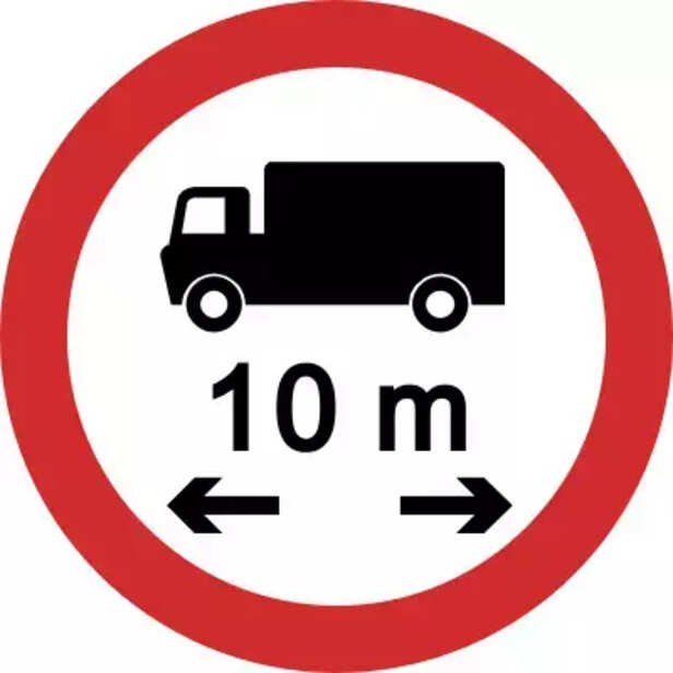 चिन्ह में ट्रक का चित्र बना हुआ है और नीचे संख्या में 10 m लिखा हुआ है, इसका अर्थ है कि सड़क पर लंबे वाहन 10 मीटर से ज्यादा नहीं होने चाहिए क्योंकि सड़क पर आगे ये लंबे वाहन सुरक्षित रूप से मुड़ नहीं सकते हैं। यह चिन्ह ज्यादातर तेज और घुमावदार मोड़ पर लगाया जाता है।
