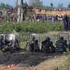 लखीमपुर में नेपाल की तरफ से पत्थरबाजी के बाद बार्डर पर स्थानीय लोग और एसएसबी के जवान। भारतीय एसएसबी के जवानों ने रोकना चाहा भीड़ ने पथराव शुरू कर दिया। खबर फ़ोर्स को मिली तो और जवान और भारतीय लोग बॉर्डर पर पहुंचे पर भीड़ नेपाली मानने को तैयार नही थी। पथराव तेज हो गया। तहसीलदार का हाथ टूट गया। नौ जवान एसएसबी के घायल हो गए। अब भी हजारों की भीड़ नेपाल की तरफ जमा है। हालात बेकाबू होते जा रहे। लखीमपुर खीरी के जिलाधिकारी और एसपी भी पहुंचे हैं।