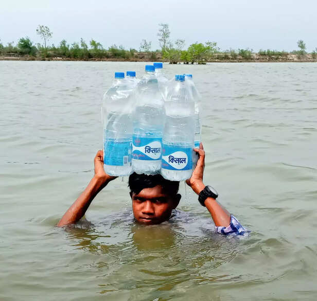 चक्रवात अम्फान के बाद बांग्लादेश के दक्षिण-पश्चिमी तट पर पीने के पानी की भारी कमी थी। युवा जलवायु कार्यकर्ता शाहीन आलम एक गांव में पानी लेकर जा रहे हैं.