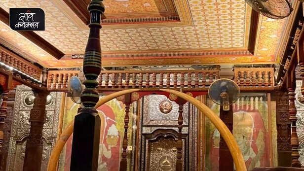 एक अलंकृत लकड़ी की नक्काशीदार रेलिंग है जो एक आड़ के रूप में काम करती है। भक्तों को अपने पुष्प चढ़ाने के लिए बैरियर के बाहर एक लंबी मेज रखी गई है - बंद दरवाजा दो असंभव लंबे और घुमावदार हाथी दांतों के पीछे चमकता है। भूतल पर ढोल बजना लगातार जारी है।