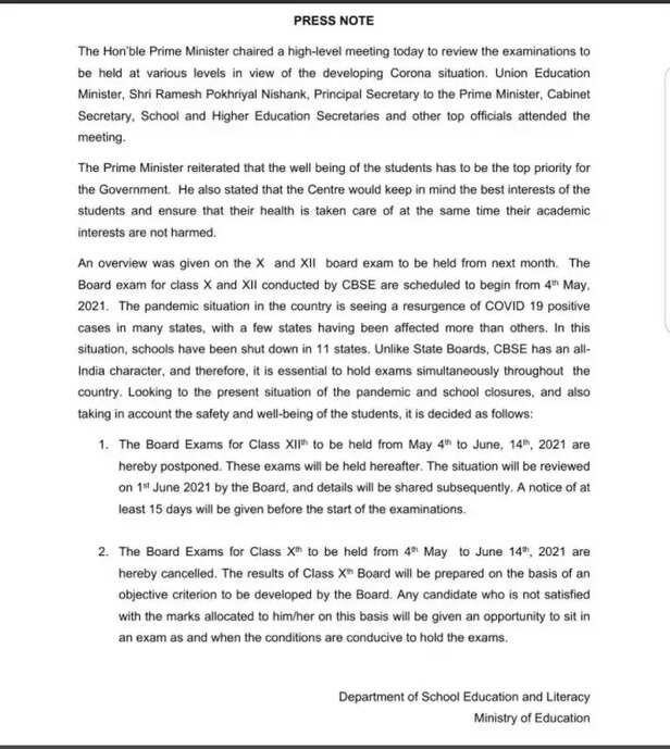 सरकार ने प्रेस विज्ञप्ति जारी करके जानकारी दी है।       केंद्रीय शिक्षा मंत्री रमेश पोखरियाल ने अपने ट्वीट में कहा, "4 मई से 14 जून तक आयोजित होने वाली दसवीं की बोर्ड परीक्षाएं रद्द कर दी गई हैं। 10वीं क्लास के छात्रों को आतंरिक मूल्यांकन के आधार पर अगली क्लास में भेजा जाएगा। अगर कोई छात्र मूल्यांकन से संतुष्ट नहीं है तो कोरोना से हालात सामान्य होने पर वह परीक्षा दे सकता है।"