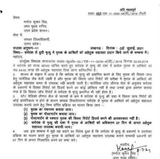 अपर मुख्य सचिव मनोज कुमार सिंह ने आदेश में कहा कि, "शासन के संज्ञान में आया है। सर्पदंश से मौत को प्रमाणित करने के लिए मृतक का विसरा जांच के लिए फॉरेंसिंक लैब भेजा जाता है और रिपोर्ट की प्रतीक्षा में आश्रितों को आर्थिक मदद नहीं मिल पाती है। दूसरी ओर फॉरेंसिक स्टेट लीगल सेल के तहत सर्पदंश के मामलों में विसरा रिपोर्ट को प्रिजर्व करने का कोई औचित्य नहीं है। साथ ही विसरा जांच रिपोर्ट से सर्पदंश से मृत्यु होने की पुष्टि भी नहीं होती है। ऐसे में पोस्टमार्टम रिपोर्ट के आधार पर 7 दिन के अंदर मुआवजा दिया जाए।"