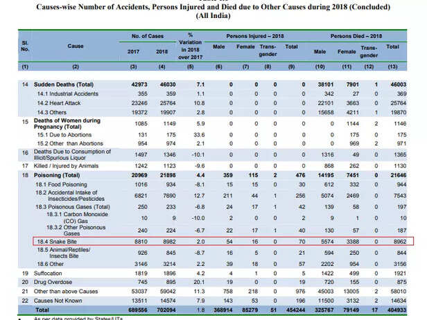 दुनियाभर में पाए जाने वाले ज्यादातर सांप जहरीले नहीं होते हैं बावजूद इसके लाखों लोगों की मौत हर वर्ष सांप के जहर से होती है। राष्ट्रीय अपराध रिकॉर्ड ब्यूरो (NCRB) एक्सीडेंटल डेथ एंड सुसाइड इन इंडिया 2018 के मुताबिक देशभर में सांप काटने से 8962 लोगों की मौत हुई थी, जिसमें 5574 पुरुष और 3388 महिलाएं शामिल थीं। देशभर में हुई मौतों में से 359 मौतें उत्तर प्रदेश में हुई थीं।