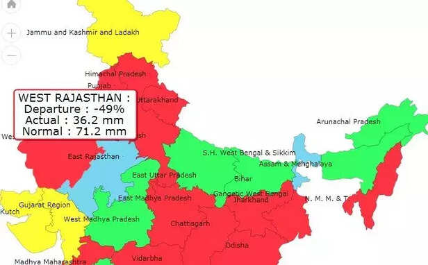 जैसलमेर में इस साल आखिरी बार 15 जुलाई को बारिश हुई थी। भारतीय मौसम विज्ञान ने राजस्थान को मौसम के अनुरुप दो भांगों में बांटा है। वेस्ट राजस्थान (पश्चिमी राजस्थान) में अगस्त महीने में 49 फीसदी कम बारिश हुई तो जबकि पूर्वी राजस्थान में सामान्य से 28 फीसदी ज्यादा बारिश हुई है। जबकि जून से 23 अगस्त तक की बात करें तो पश्चिमी राजस्थान में 20 फीसदी कम बारिश दर्ज की गई है।