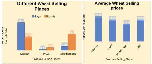 इस सर्वेक्षण से पता चला कि गया जिले में 85.7 प्रतिशत किसान उत्तरदाताओं ने कहा कि वे अपना गेहूं बाजार में बेचते हैं। इसके साथ ही पूर्णिया जिले में सर्वेक्षण में शामिल 50 फीसदी लोगों ने कहा कि उन्हें अपनी फसल बिचौलियों को बेचना पड़ता है।