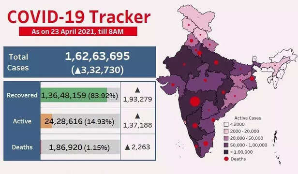 देश में कोरोना अपनी पूर रफ्तार के साथ आगे बढ़ रहा है। स्वास्थ्य एवं परिवार कल्याण मंत्रालय की ओर से जारी आंकड़ों के मुताबिक, पिछले 24 घंटे में लगातार दूसरे दिन गुरुवार 22 अप्रैल को देश में कोरोना के 3,32,730 मामले सामने आए। इसमें 75.01 प्रतिशत केस अकेले 10 राज्यों में मिले, जिसमें महाराष्ट्र, उत्तर प्रदेश, दिल्ली, कर्नाटक, केरल, छत्तीसगढ़, मध्य प्रदेश, तमिलनाडु, गुजरात और राजस्थान शामिल हैं।