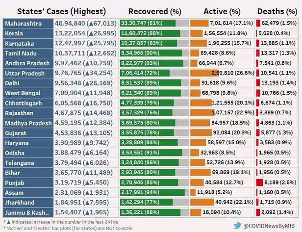 महाराष्ट्र में 24 घंटे में सबसे अधिक 67,013 नए मामले दर्ज किए गए, जबकि इसके बाद उत्तर प्रदेश में 34,254 और केरल में 26,995 नए मामले आए। देश में कुल एक्टिव केसों की संख्या 24,28,616 पहुंच गई है। कुल एक्टिव केस में से 59.12 प्रतिशत केस सिर्फ महाराष्ट्र, उत्तर प्रदेश, छत्तीसगढ़, कर्नाटक और केरल से हैं।