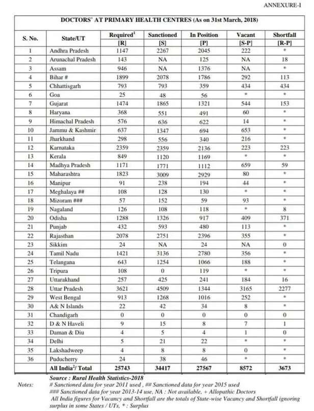 सदन में दिए गए उत्तर से पता चलता है कि उत्तरप्रदेश में पीएचसी के लिए 4,509 डॉक्टरों की स्वीकृत संख्या है, लेकिन कुल 1,344 डॉक्टर ही हैं और 3,165 जगहें खाली हैं। यह सूची 2,277 डॉक्टरों की कमी को प्रदर्शित करता है।
