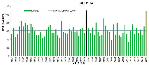 पिछले 121 में मई महीने में हुई बारिश। ग्राफ- IMD       भारत मौसम विभाग के आंकड़ों के मुताबिक पूरे देश में पिछले 121 वर्षों (1901-2021 के बीच मई महीने में दूसरी बार सबसे ज्यादा बारिश इस बार दर्ज की है। इससे पहले रिकॉर्ड बारिश मई महीने में 1990 में दर्ज की गई थी।