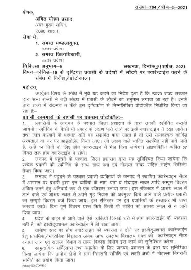 देश भर में कोरोना के संक्रमण बढ़ने और कई राज्यों में लॉकडाउन लगने से एक बार फिर लोग अपने गाँवों के लिए वापस लौटने लगे हैं। कोरोना के संक्रमण को रोकने के लिए यूपी सरकार ने प्रवासियों के लिए कुछ नियम बनाए हैं, बाहर से आए लोगों को जिनका पालन कर होगा।