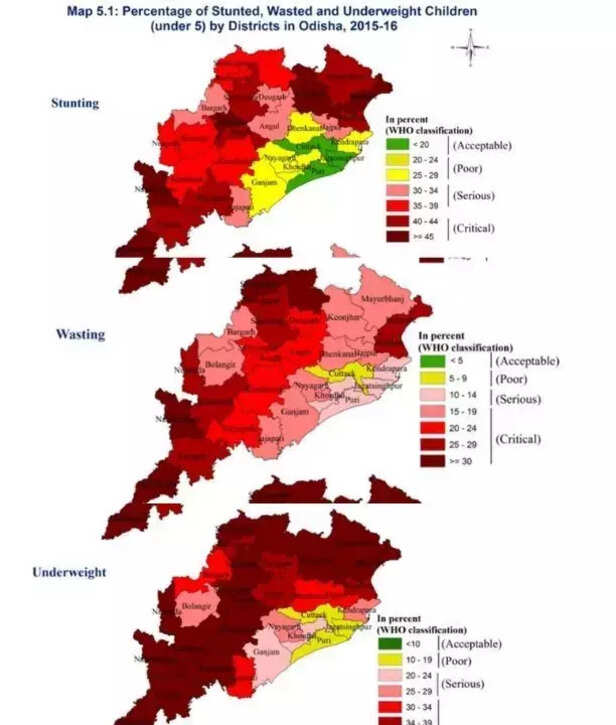 केंद्रीय स्वास्थ्य मंत्रालय के राष्ट्रीय परिवार स्वास्थ्य सर्वेक्षण 2015-16 के अनुसार, ओडिशा में 15 से 49 वर्ष की आयु की हर दूसरी (51 प्रतिशत) महिला एनीमिया से पीड़ित है। वहीं, छह से 59 महीने के बीच के 44.6 प्रतिशत बच्चों को एनीमिया है। इसके साथ ही रिपोर्ट के मुताबिक 5 वर्ष से कम आयु के हर तीसरे (34.1 प्रतिशत) बच्चे का उम्र के अनुसार (उम्र के अनुसार ऊंचाई का कम होना) विकास नहीं हो पाया है।