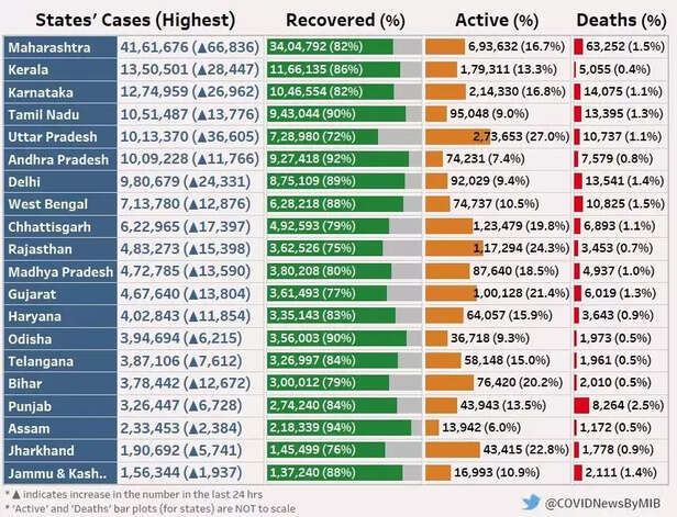 वहीं महाराष्ट्र और दिल्ली में ही अकेले 1000 से ज्यादा लोगों की मौत की मौत हो गई है. दिल्ली में 24 घंटे में 24,331 नए केस सामने आए, जबकि 348 लोगों की जान चली गई है. दिल्ली में एक्टिव केस का भी रिकॉर्ड बन गया है. राज्य में पहली बार यह आंकड़ा 92 हजार के पार पहुंच गया। वहीं महाराष्ट्र में एक दिन में 773 लोगों की मौत हो गई, जबकि 66,836 नए केस मिले। इसके अलावा केरल में 28,447, कर्नाटक में 26,962 नए केस 24 घंटे में सामने आए हैं।