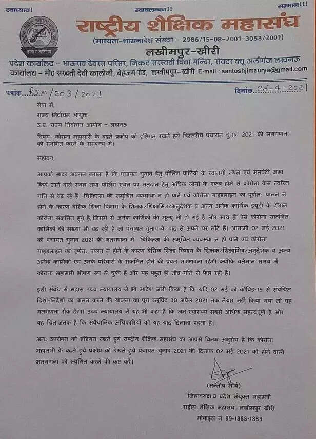 संतोष मौर्य ने पत्र में लिखा है, "इन मुद्दों को ध्यान में रखते हुए और सार्वजनिक स्वास्थ्य को महत्व देते हुए, हम आपसे 2 मई को मतगणना स्थगित करने का आग्रह करते हैं।"