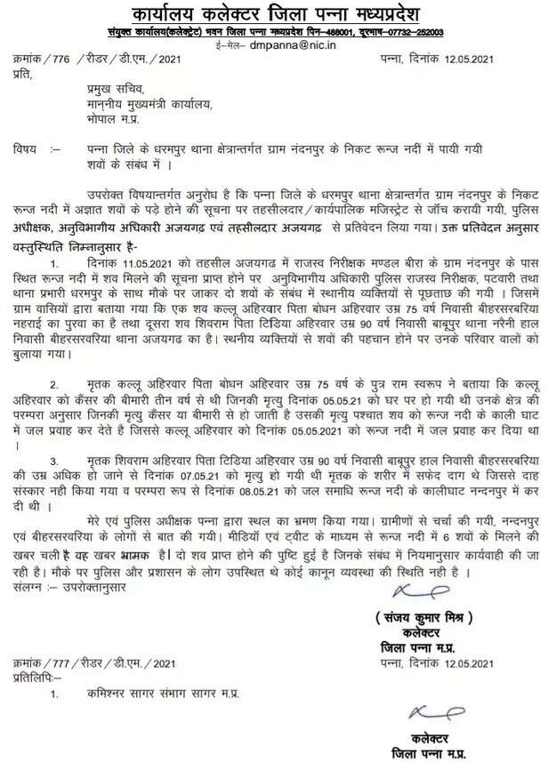 रुंज नदी में कई शवों के मिलने की अफवाह के इस बेहद संवेदनशील मामले की मजिस्ट्रेट जांच भी कराई गई है। अनुविभागीय अधिकारी अजयगढ़ व तहसीलदार अजयगढ़ ने जो प्रतिवेदन सौंपा है, उसके मुताबिक एक शव कल्लू अहिरवार उम्र 75 वर्ष निवासी बीहर सरवरिया नहराई के पुरवा का है और दूसरा शव शिवराम पिता टिडिया अहिरवार 90 वर्ष निवासी बाबूपुर थाना नरैनी हाल निवास बीहर