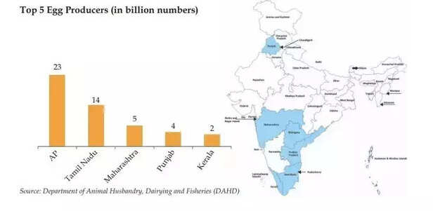मत्स्यपालन, पशुपालन और डेयरी मंत्रालय के अनुसार देश में प्रमुख अंडा उत्पादक राज्यों में आंध्र प्रदेश (19.1 %), तमिलनाडु (18.2 %) तेलंगाना (13.2 %) , पश्चिम बंगाल (8.3 %) , हरियाणा (5.2 %) प्रमुख राज्य हैं। इसके पंजाब, उत्तर प्रदेश जैसे राज्य आते हैं।