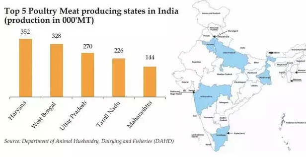 मत्स्यपालन, पशुपालन और डेयरी मंत्रालय के अनुसार देश में प्रमुख पोल्ट्री मीट उत्पादक राज्यों में पहले नंबर पर आंध्र प्रदेश, उसके बाद पश्चिम बंगाल, उत्तर प्रदेश, तमिलनाडु और महाराष्ट्र जैसे राज्य आते हैं।