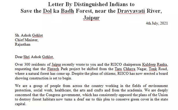 पत्र में कहा गया है कि जहां एक तरफ जयपुर विकास प्राधिकरण अधिक पेड़ लगाने की योजना बना रहा है, वहीं रीको इस वन क्षेत्र को नष्ट करने के की योजना बना रहा है।