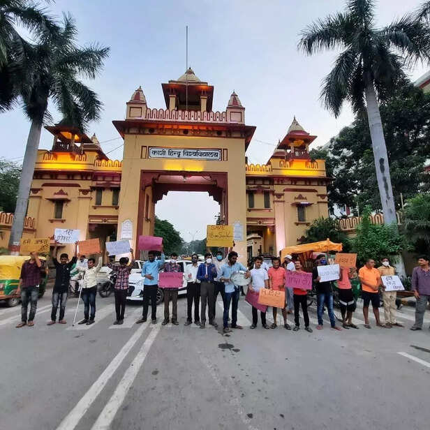 काशी हिंदू विश्वविद्यालय के सामने प्रदर्शन करते दिव्यांग छात्र। सभी फोटो: अरेंजमेंट       गोरखपुर के महईता गांव के रहने वाले गणेश यादव (21 वर्ष) भी कक्षा दसवीं के छात्र हैं। गणेश कहते हैं, "विद्यालय प्रशासन ने कोरोना जैसी आपदा को अवसर बनाते हुए हम जैसे दिव्यांग बच्चों के जीवन को अंधकारमय कर दिया।"