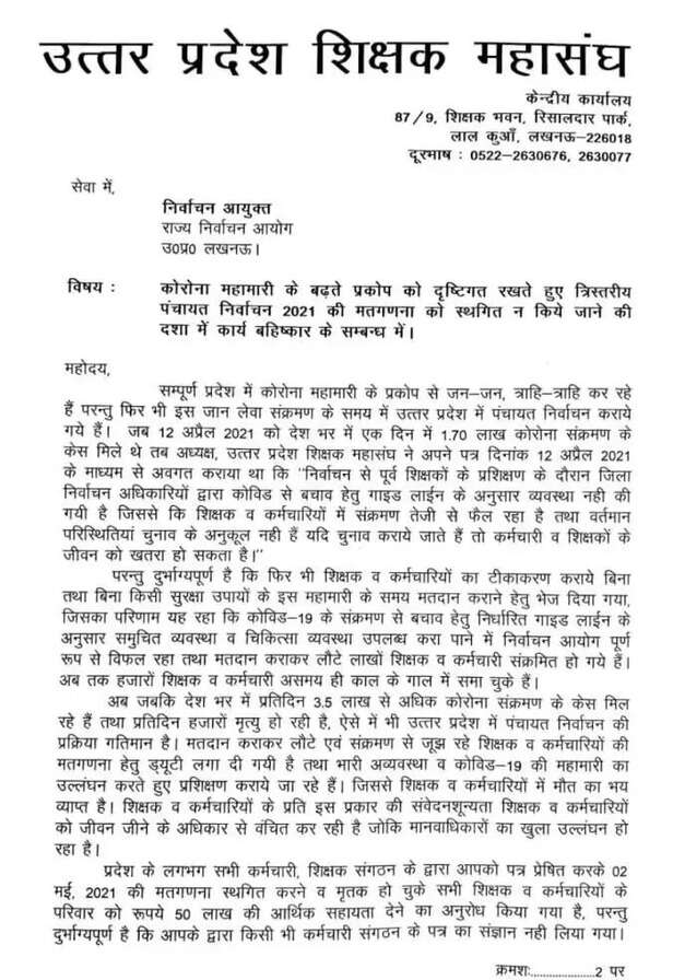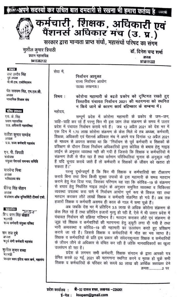दिनांक 30 अप्रैल को राज्य चुनाव बोर्ड के चुनाव आयुक्त को संबोधित एक पत्र में लखनऊ स्थित संघ – 'कर्मचारी, शिक्षक, अधिकारी और पेंशनर्स अधिकार मंच' ने कहा है कि चुनाव आयोग एसोसिएशन के सदस्यों की सुरक्षा करने में विफल रहा है। संघ का कहना है कि उनके जिन सदस्यों को चुनावी ड्यूटी में लगाया गया था, उनमें से कई संक्रमित हो गए, जबकि सैकड़ों लोगों की मृत्यु भी हो गई।