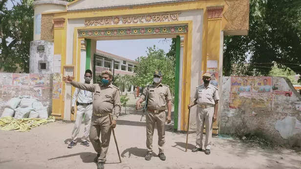 लखनऊ के कुम्हरावां इंटर कॉलेज में बने मतदान केंद्र के बाहर तैनात पुलिसकर्मी। फोटो- अरविंद शुक्ला।       कोरोना को लेकर सवाल करने पर डॉ. प्राण कहते हैं, "संक्रमण का खतरा तो बढ़ा ही है। चुनाव आगे बढ़ने चाहिए थे, लेकिन लंबे समय से प्रक्रिया चल रही थी इसलिए शायद रोका नहीं गया होगा। अब खतरा तो हैं, लेकिन गांव के लोगों की रोग प्रतिरोधक क्षमता, उनका खानपान और पर्यावरण उन्हें लड़ने की शक्ति देगा तो मैं उम्मीद करता हूं कि शहर जैसे हालात नहीं होंगे।"