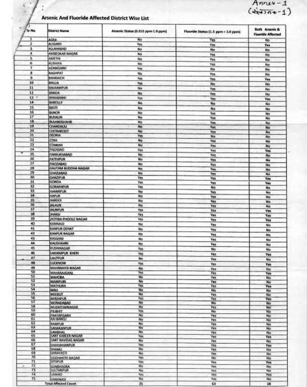 पेयजल और स्वच्छता विभाग के 2019 के आंकड़ों के मुताबिक उत्तर प्रदेश के कुल 75 जिलों में से 63 जिलों के पानी में निर्धारित सीमा से अधिक फ्लोराइड है और 25 जिले उच्च आर्सेनिक से प्रभावित हैं। राज्य के 18 जिले ऐसे हैं जहां के भूजल में फ्लोराइड और आर्सेनिक दोनों की मात्रा बहुत ज्यादा है। ग्रामीणों की शिकायत है कि वे साफ पानी खरीदने के लिए पैसे खर्च करने को मजबूर हैं।