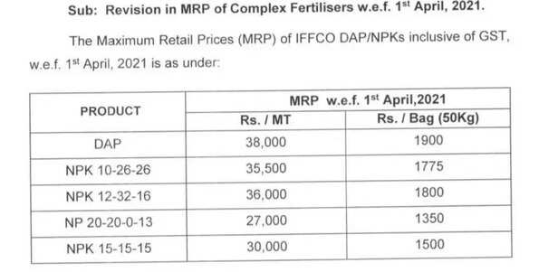 दरअसल, सोशल मीडिया और किसानों के व्हाट्सअप ग्रुप में 7 अप्रैल से विश्व की सबसे बड़ी उर्वरक सहकारी संस्था इफको का मेल वायरल हो रहा है, जिसमें कहा गया है कि फास्फेट फर्टिलाइजर में भारी बढ़ोतरी हो गई है। इस मेल के अनुसार एक अप्रैल से डीएपी की 50 किलो की बोरी की कीमत 1900 रुपये, एनपीके (10:26:26) 1775 रुपये, एनपीके (12:32:16) 1800 रुपये, एनपी (20:20:0:13) 1350 रुपये और एनपीके (15:15:15) 1350 रुपये होगी।
