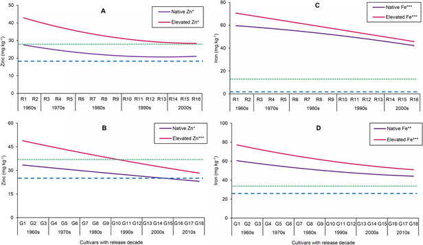 जबकि 1960 के दशक में गेहूं की किस्मों में जिंक और आयरन का घनत्व 33.3 मिलीग्राम / किलोग्राम और 57.6 मिलीग्राम / किलोग्राम था। जबकि, वर्ष 2010 में जारी की गई गेहूं की किस्मों में जिंक एवं आयरन की मात्रा घटकर क्रमशः 23.5 मिलीग्राम / किलोग्राम और 46.5 मिलीग्राम / किलोग्राम रह गई।