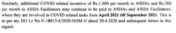 राष्ट्रीय स्वास्थ्य मिशन द्वारा जारी 4 मई 2021 को जारी एक आदेश में कहा गया है: "... आशा को 1,000 रुपये प्रति माह और आशा सुविधाकर्ताओं को 500 रुपये प्रति माह का अतिरिक्त COVID संबंधित प्रोत्साहन आशा और आशा सुविधाकर्ताओं को भुगतान करना जारी रखा जा सकता है, जहां वे हैं अप्रैल 2021 से सितंबर 2021 तक COVID संबंधित कार्यों में शामिल।"