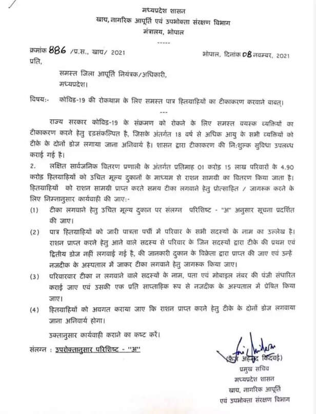 इस संबंध में खाद्य एवं नागरिक आपूर्ति विभाग, मध्य प्रदेश सरकार ने 8 नवंबर को एक आदेश भी जारी किया है। प्रमुख सचिव फैज अहमद किदवई ने अपने इस हस्ताक्षरित आदेश में कहा है कि पीडीएस दुकानदार राज्य में एक करोड़ 15 लाख परिवारों के सभी योग्य सदस्यों का टीकाकरण सुनिश्चित करें।