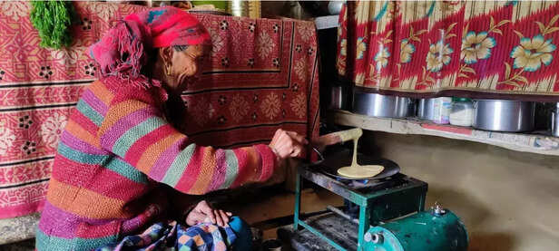 छिंदु गाँव की बिरमा देवी सिलिकोटा (फाँफर की रोटी) बनाते हुए। इनका पीहर नेपाल में है।