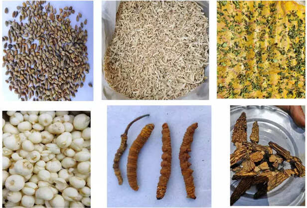 बाएँ से दाएँ - फाँफर, घिसी हुई लफू, हरी सब्ज़ी, जंगली लहसुन,कीड़ाजड़ी, जंगली मशरूम।