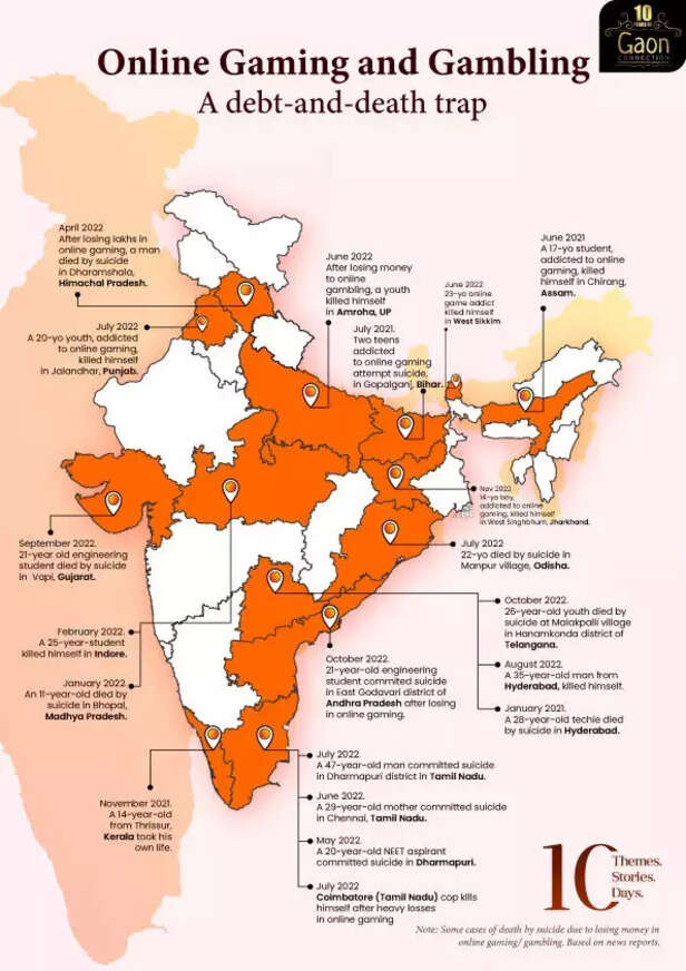 उदाहरण के तौर पर इस साल जुलाई में ओडिशा के केंद्रपाड़ा के मानपुर गाँव के एक 22 साल के युवक ने ऑनलाइन गेमिंग में पैसे गंवाने के बाद खुद की जान ले ली। दो महीने बाद सितंबर में, गुजरात के वापी के एक 21 साल के इंजीनियरिंग छात्र ने ऑनलाइन जुए में पैसे हारने के बाद खुद की जान ले ली।